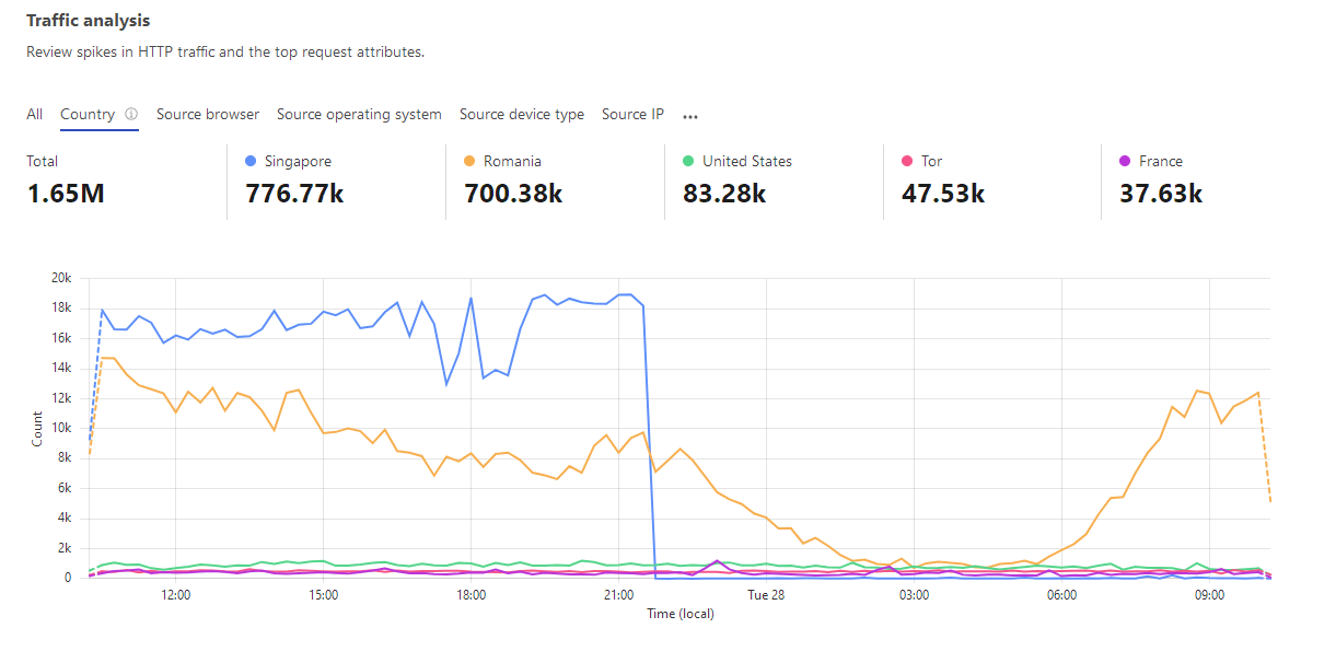 Ai cloudflare ca de acolo sunt printscreenurile, security->WAF add rule (ip.src.country eq „SG”). bine, nu ca asta ar rezolva mare lucru.