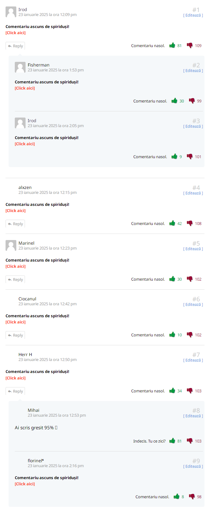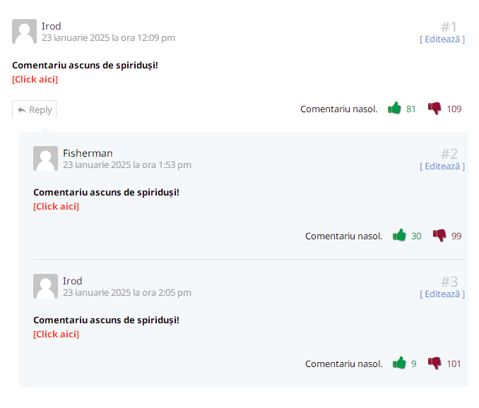 Ați văzut că sunt momente în care apar zeci de voturi negative la comentarii. Este foarte neplăcut pentru voi mai ales, că ăsta este și scopul, cititorul să vadă că al lui comentariu are sute de downvotes și să se demoralizeze și să nu mai comenteze.