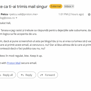 Reproșul meu fata de tine era promovarea ideii ca daca a primit mail de la [email protected] inseamna ca si-a trimis singur.