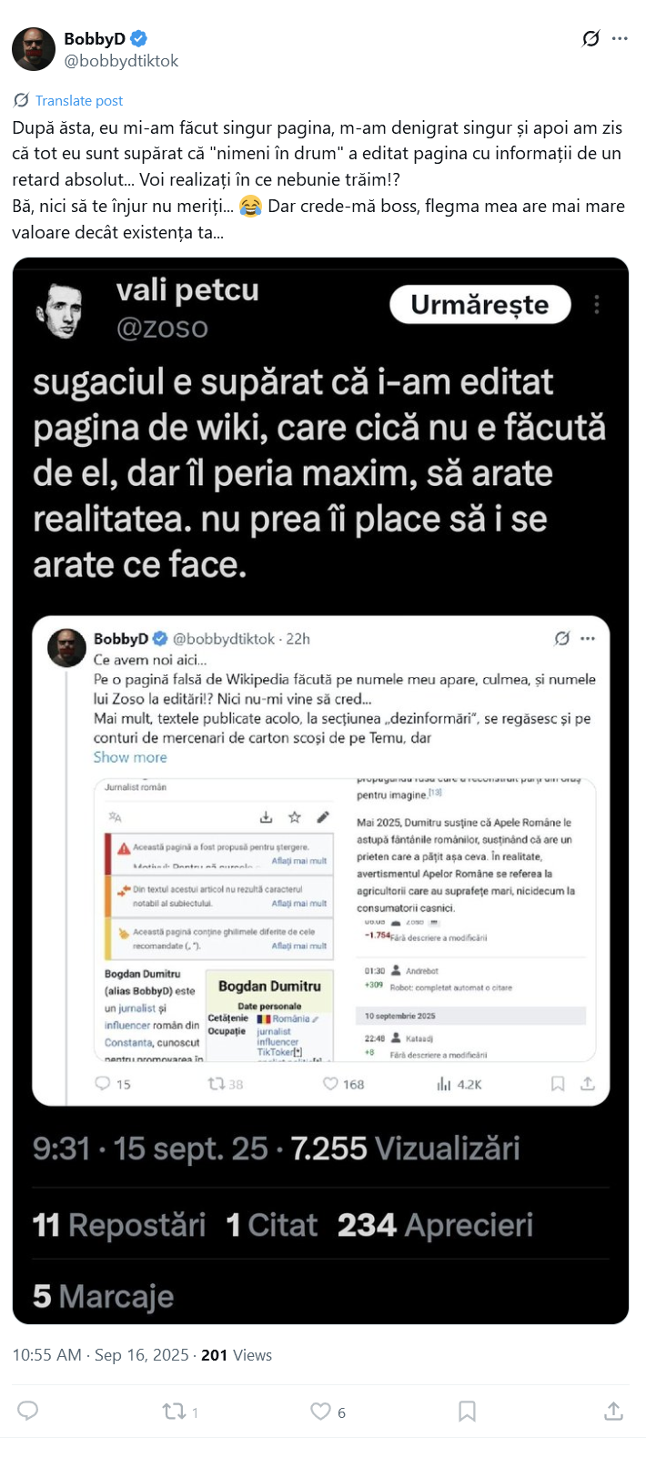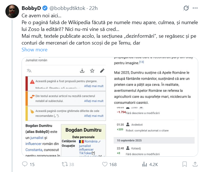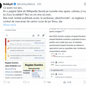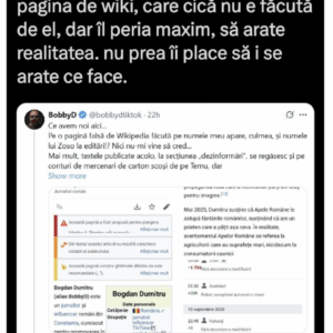 Omul crede că pagina aia e falsă, că atât îl duce capul. Apoi, bănuiesc că cineva i-a arătat că eu am editat și am adăugat acolo, așa că sare pe mine. „Mercenari de pe temu” bănuiesc că la mine se referă, deși eu sunt aici de 20 de ani, nu de ieri, ca el. Mă gândesc că schemele astea sunt bune în caz de proces, că poate susține că este incompetent și nu are proprietatea termenilor și folosi asta ca dovadă.
