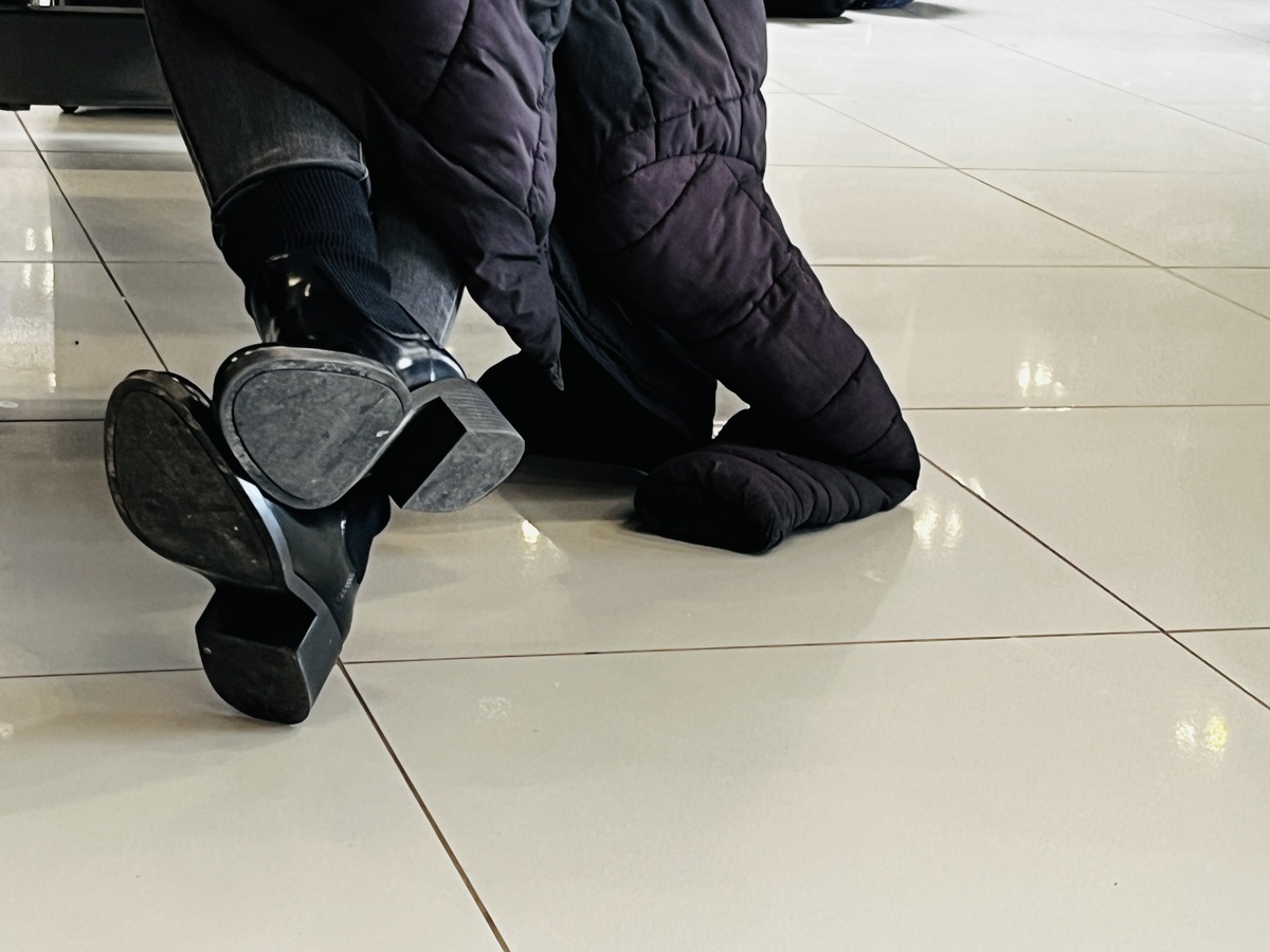 Și mi-am scos, ca niciodată, și adidașii, și mi-a desfăcut și geanta, și m-a pus și la scannerul ăla cu urme de tălpi și mi-a dat și cu hârtiuță pe mâini și pe geantă.