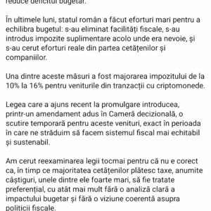 Ar fi fost o masura buna asta cu crypto. Anaf a spus ca foarte greu reuseste sa urmareasca zona asta de crypto – daca impozitul ar fi 0, brusc ar intra in tara sume pe care de altfel anaf n-are cum sa le urmareasca. Dupa aia anaf poate veni si sa intrebe ok ii ai, dar de unde si de cand.
