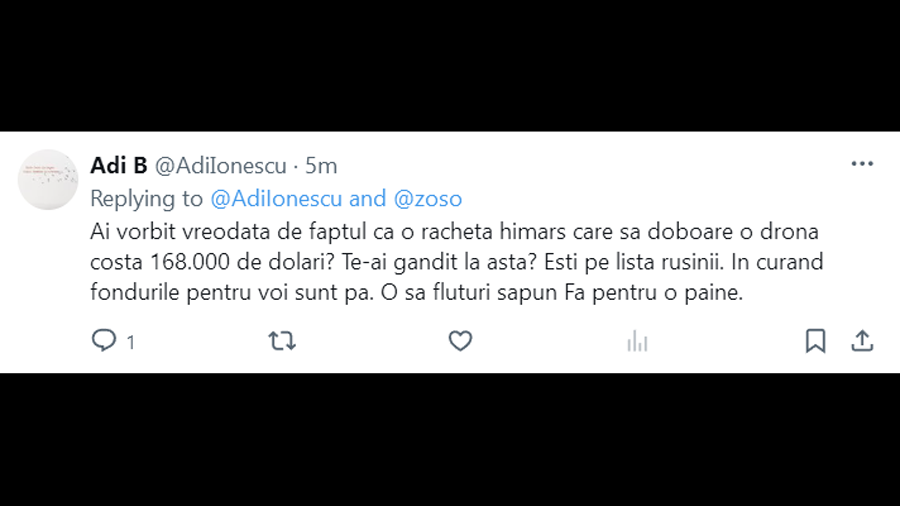 1. Sincer, 168000 de dolari pentru o racheta himars care sa doboare o drona e ieftin de tot.