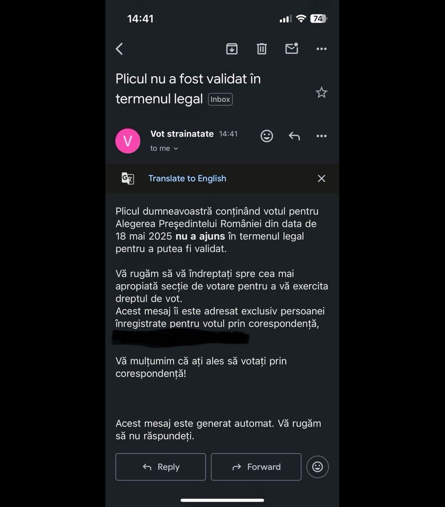 Persoane din diaspora care au votat prin corespondență au primit azi următorul mail.