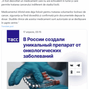 Apropo de captura despre medicamentul minune, care vindecă/combate (aproape) orice tip de cancer, testat și sigur. în Federația Rusă. Chiar aseară, după Înviere, cineva amintea, printre altele (vorbindu-se despre cunoștințe decedate din cauza cancerului), despre un nu-știu-cine medic care ar furniza un astfel de medicament (o variantă aproximativă). Aflu din articolul ăsta, din ce aflăm din captură că de fapt este o gogoriță branduit-ă TASS, probabil ca să creeze atitudini pozitive față de Federația Rusă. Și a ajuns la mase. Până la firul ierbii.