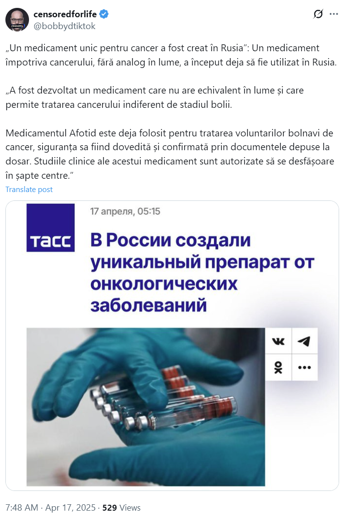 Apropo de captura despre medicamentul minune, care vindecă/combate (aproape) orice tip de cancer, testat și sigur. în Federația Rusă. Chiar aseară, după Înviere, cineva amintea, printre altele (vorbindu-se despre cunoștințe decedate din cauza cancerului), despre un nu-știu-cine medic care ar furniza un astfel de medicament (o variantă aproximativă). Aflu din articolul ăsta, din ce aflăm din captură că de fapt este o gogoriță branduit-ă TASS, probabil ca să creeze atitudini pozitive față de Federația Rusă. Și a ajuns la mase. Până la firul ierbii.
