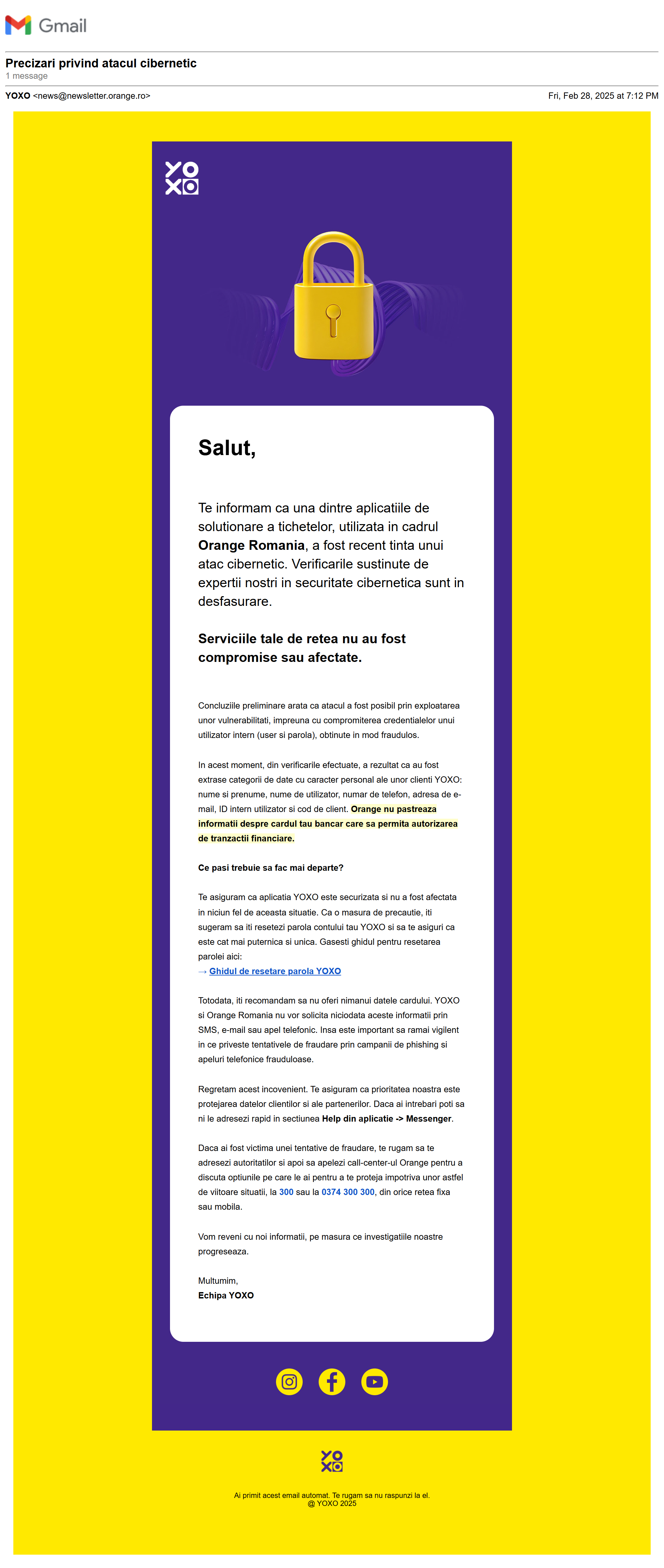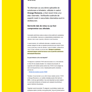 „Te rugam sa fii vigilent la fraudele din mediul online si sa nu dai curs solicitarilor privind datele cardului sau alte informatii personale. Nu raspunde solicitarilor „urgente” ale necunoscutilor, nu da click pe link-uri din surse straine si verifica mereu autenticitatea mesajului primit. Afla mai multe detalii aici. https://www.yoxo.ro/prevenire-frauda/„